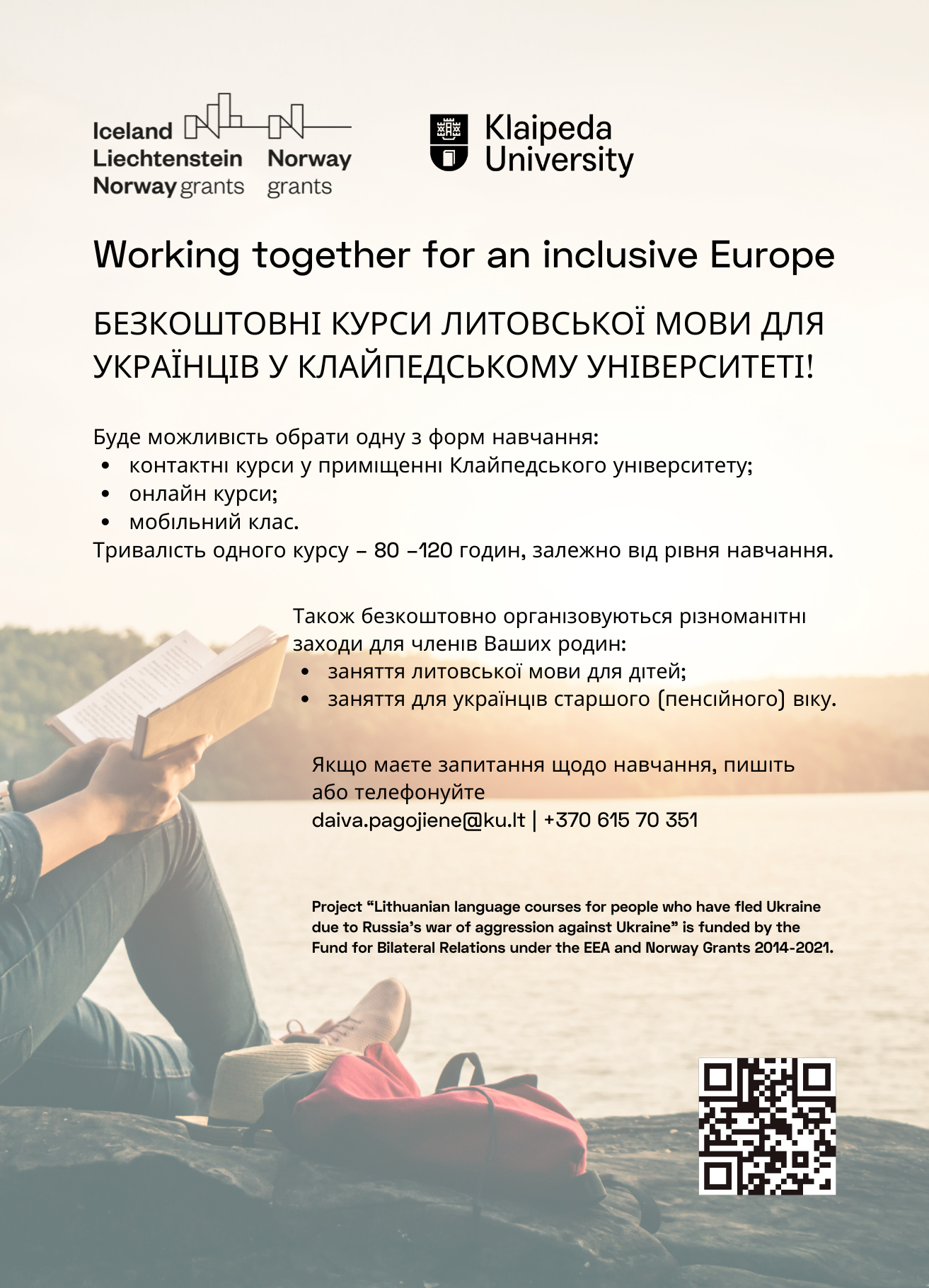 - Klaipėdos universitetas: dr. Daiva Pagojienė, daiva.pagojiene@ku.lt, +370 615 70351; dr. Kristina Blockytė-Naujokė, kristina.blockyte-naujoke@ku.lt, +370 683 86067.
