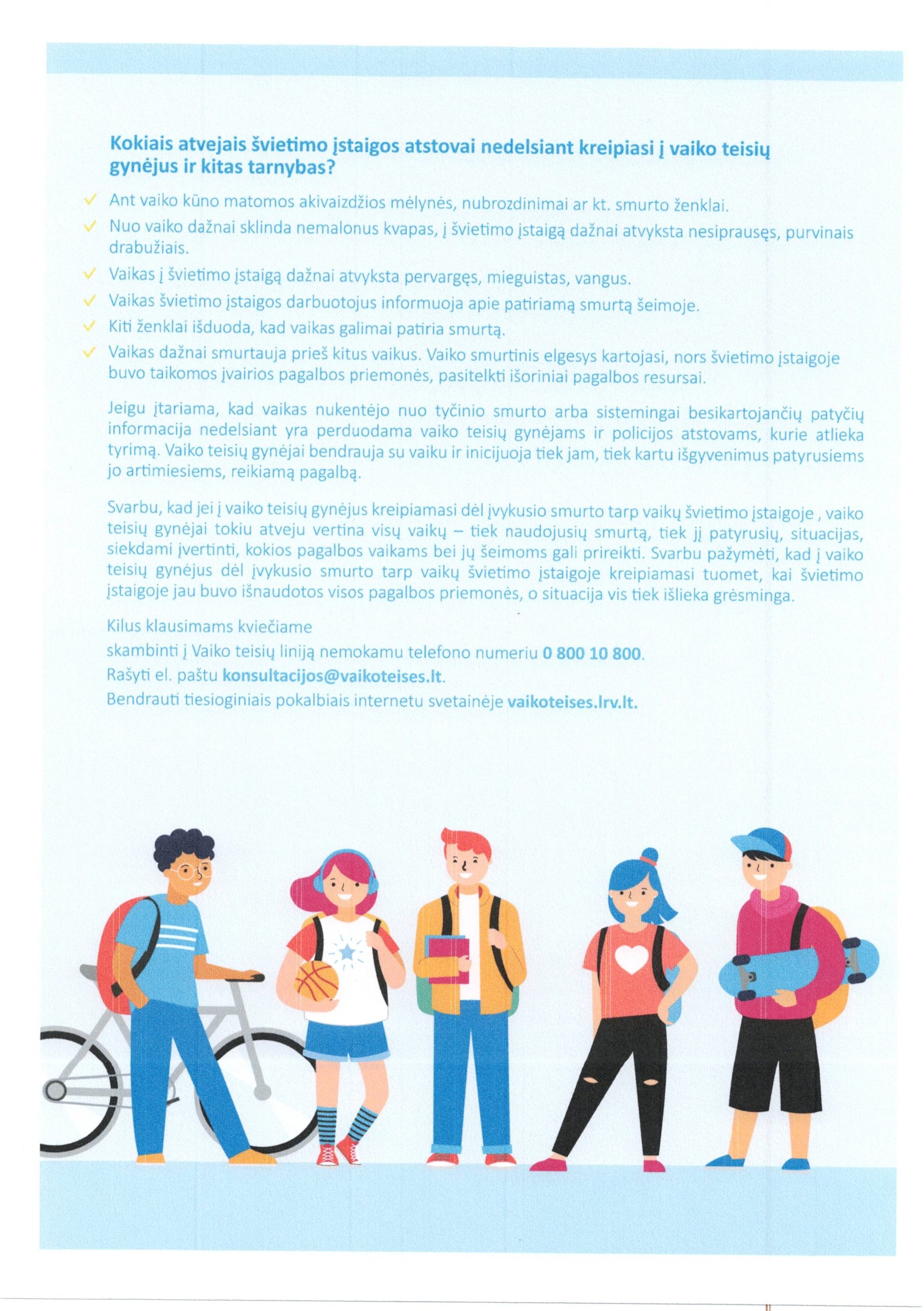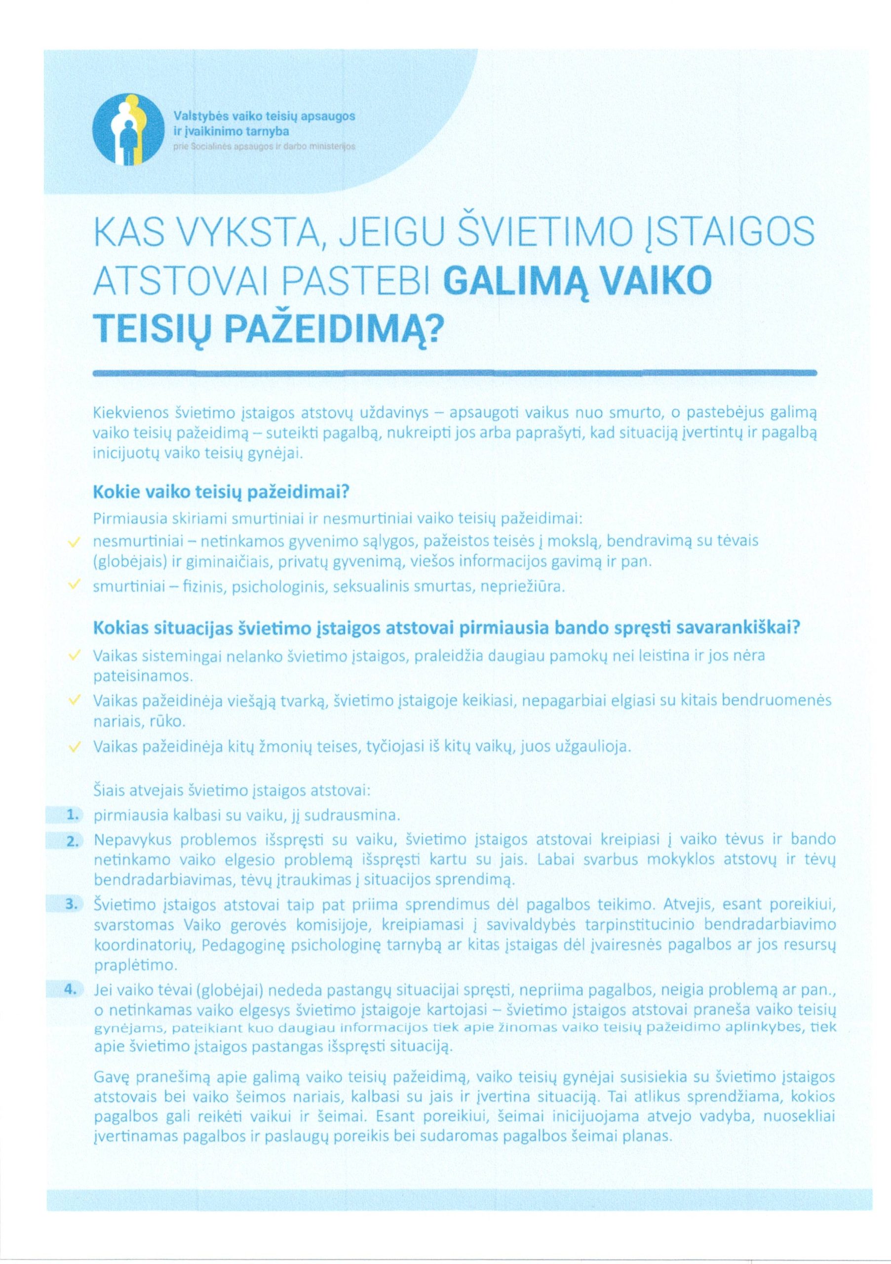 Dalinamės Valstybės vaiko teisių apsaugos ir įvaikinimo tarnybos prie Socialinės apsaugos ir darbo ministerijos parengtu infografiku „Kas vyksta, jeigu švietimo įstaigos atstovai pastebi galimą vaiko teisių pažeidimą?“