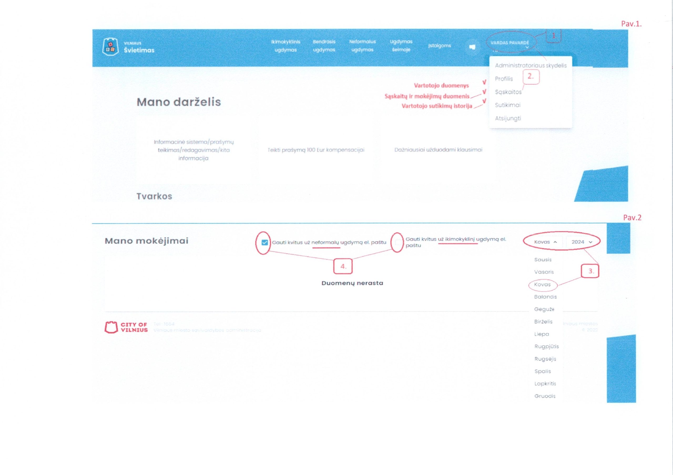Prisijungus prie sistemos, viršuje, dešinėje pusėje reikia paspausti ant savo vartotojo pavadinimo (1) ir pasirinkti „Sąskaitos“ (2). Atsivėrusiame lange (Pav.2) pasirinkus periodą (3), galima peržiūrėti visų sąskaitų ir mokėjimų duomenis, matyti bei atnaujinti sutikimų informaciją (4).