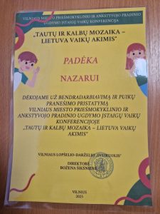 Šiandien mūsų įstaigos gr. „Bitutė“ ugdytinis Nazar Vilniaus miesto priešmokyklinio ir ankstyvojo ugdymo įstaigų vaikų konferencijoje „Tautų ir kalbų mozaika – Lietuva vaiko akimis“ deklamavo eilėraštį apie Visaginą – miestą, kuriame gyvena Nazaro močiute ir senelis. Renginio metu vaikas klausėsi bendraamžių pranešimų, demonstravo smalsumą ir pagarbą kitų tautų kultūriniams skirtumams. Dalyvavimas konferencijoje prisidėjo prie ugdytinio tarpkultūrinio sąmoningumo, komunikavimo gebėjimų ir pasitikėjimo savimi stiprinimo. Dėkojame lietuvių kalbos mokytojai Daivai G. už puikų pasiruošimą ir dalyvavimą.